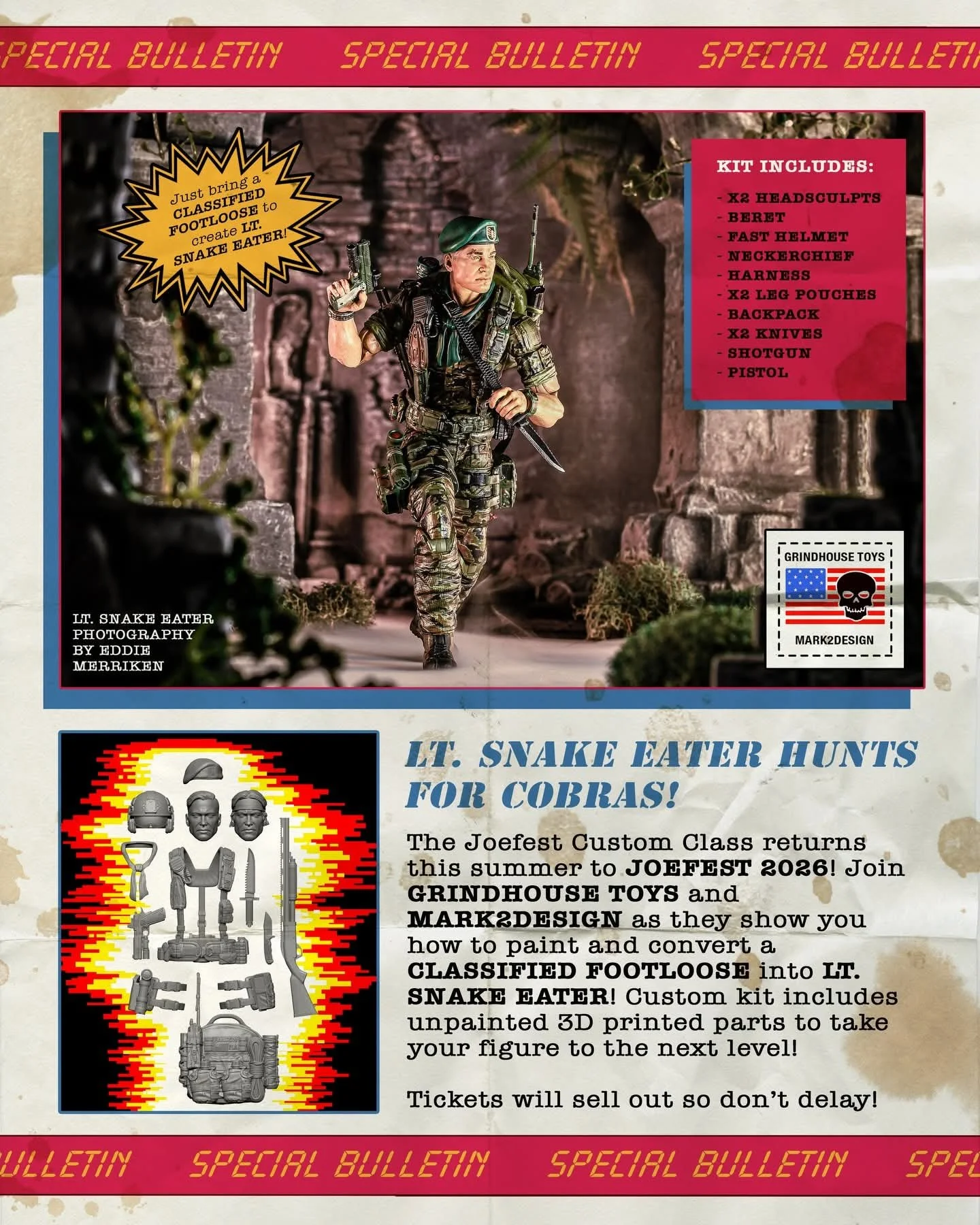 We’re back baby!!! @joefest_toy_comic 2026 custom class returns this year with a new figure conversion kit! Join us as we teach you how to modify an existing GIJOE Classified figure into Lt. Snake Eater! Each kit comes with: x2 headsculpts, beret, fast helmet, neckerchief, harness, x2 leg pouches, backpack, x2 knives, shotgun, and pistol. You just bring a Classified Footloose and we will teach you the rest. Class will be taught by Chris Scott of Grindhouse Toys and Mark Gerwig of @mark2design with a little help from their friends; @raymurphygijaf @kr_cus_toms @elitecobra2000 Tickets are on sale now at www. Grindhousetoys.com! Don’t delay as tickets will sell out!!